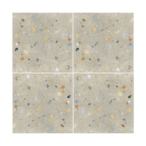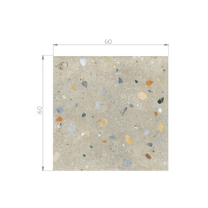 TIPOLOGÍA Gres Rectificado SERIE Terrazo TERMINACIÓN Mate GRÁFICAS 6 caras FORMATO 60 x 60 cm ESPESOR 9,5 mm USO Piso y Muro ABSORCIÓN DE AGUA 1 a 3 % TRÁFICO PEI 4 – Residencial Alto y Comercial Moderado RESISTENCIA AL DESLIZAMIENTO R9 ORIGEN China UNIDADES POR CAJA 4 Palmetas M2 POR CAJA 1,44 m2 PESO POR CAJA 29 kg