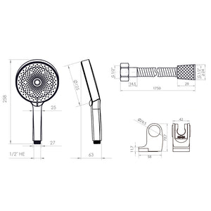 FUNCIONAMIENTO Juego de Ducha con Maneral de 3 funciones. CONEXIÓN 1/2” HE a flexible. MATERIAL Polimetro de Alta Resistencia (ABS). INCLUYE Maneral 3 funciones, soporte móvil y flexible de 175 cm.